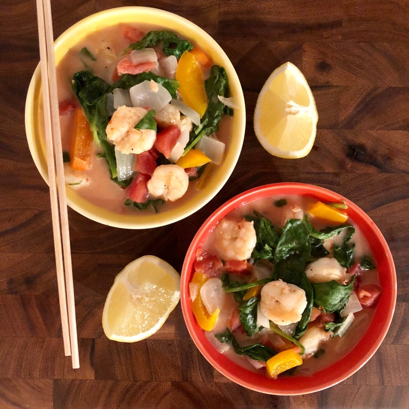 When temperatures drop, chilis and soups shouldn’t be your only go-tos. This Thai-inspired Tomato, Coconut Shrimp is a favorite of mine. It’s perfect alone or served over rice–white, brown, jasmine or cauliflower, you pick. This dish is not only warming and satisfying, but also lean and clean.